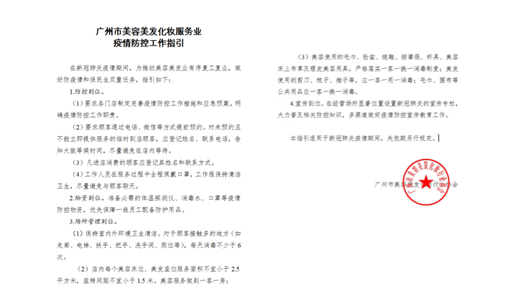 《指引》指出,新常态下疫情防控工作要抓好防控专项工作组成立、复产前评估、从业人员健康分级状况报告、临时医学观察点和隔离场所设立、营业中卫生管理、公共场所内卫生管理、场所通风、从业人员卫生、出现疫情后防控措施这九方面进行开展。本着“安全为上,保障民生”原则,市美容美发化妆行业协会面向全市会员单位制定了《美容美发化妆服务业疫情防控工作指引》,明确了疫情期间美容美发场所的各项营业要求,做到防控到位、物资到位、场所管理到位、宣传到位: