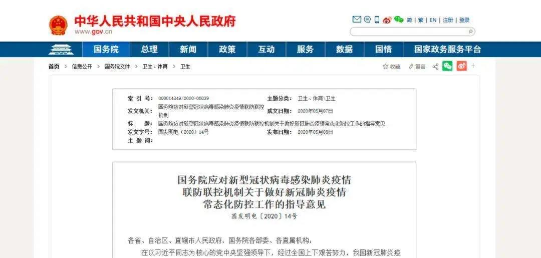 5月8日, 国务院印发《国务院应对新型冠状病毒感染肺炎疫情联防联控机制关于做好新冠肺炎疫情常态化防控工作的指导意见》,按照相关技术指南,在落实防控措施前提下,全面开放商场、超市、宾馆、餐馆等生活场所;采取预约、限流等方式,开放公园、旅游景点、运动场所,图书馆、博物馆、美术馆等室内场馆,以及影剧院、游艺厅等密闭式娱乐休闲场所,可举办各类必要的会议、会展活动等。(来源:南方+)