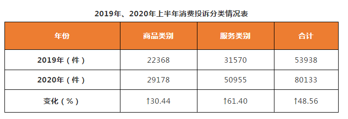 与去年同期相比,今年上半年的投诉量上升了48.56%;各类商品和服务的投诉量普遍增加。其中,