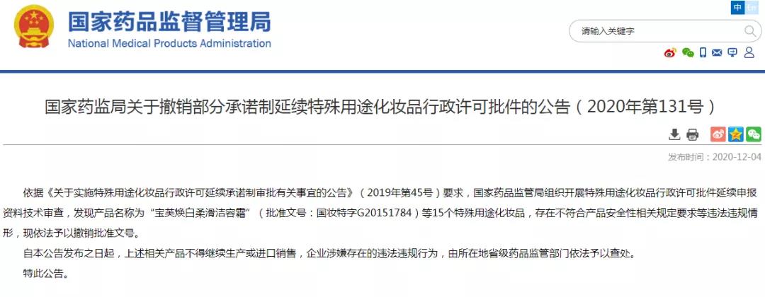 12月4日,国家药品监督管理局官网发布《国家药监局关于撤销部分承诺制延续特殊用途化妆品行政许可批件的公告》(2020年第131号)。