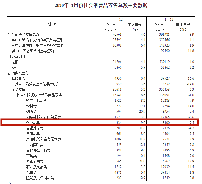 1月18日,国家统计总局发布最新零售数据,2020年1-12月,社会消费品零售总额39万亿元,比上年下降3.9%。其中,化妆品类零售额达3400亿元,同比上升9.5%。