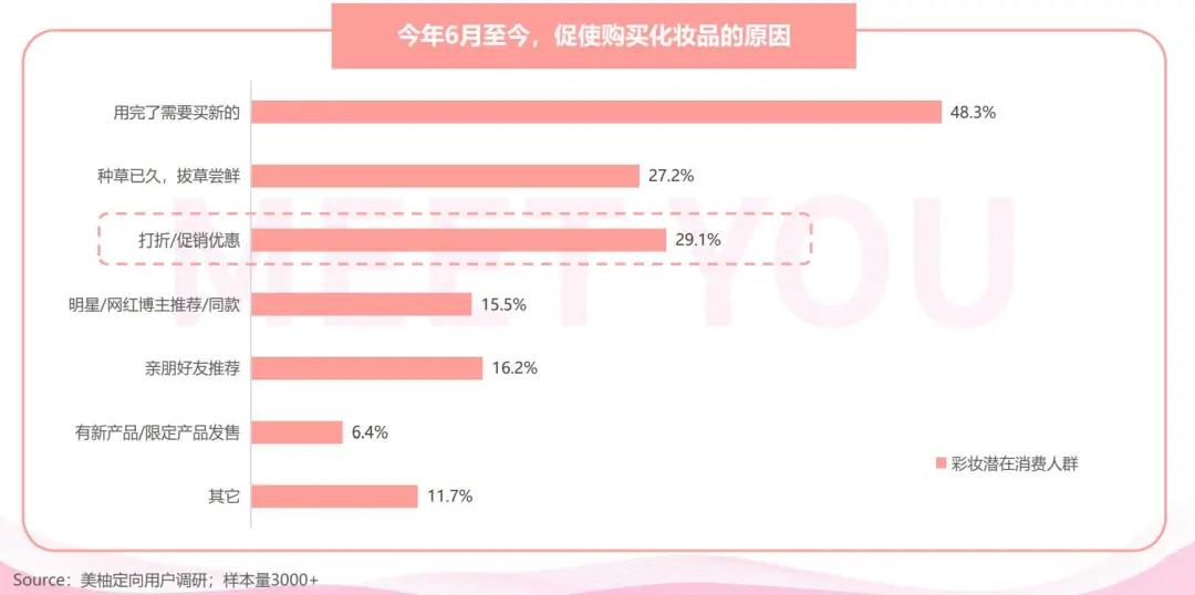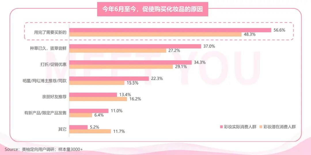 无论是彩妆实际消费者或是潜在消费者在面对彩妆消费时都较为理性,会在产品用完之后再去购买新的。因此面对“理性消费”的群体,商家需要多刺激消费者产生购买欲望,例如明星/网红/KOL种草、打折促销、限定主题产品发售等营销策略。