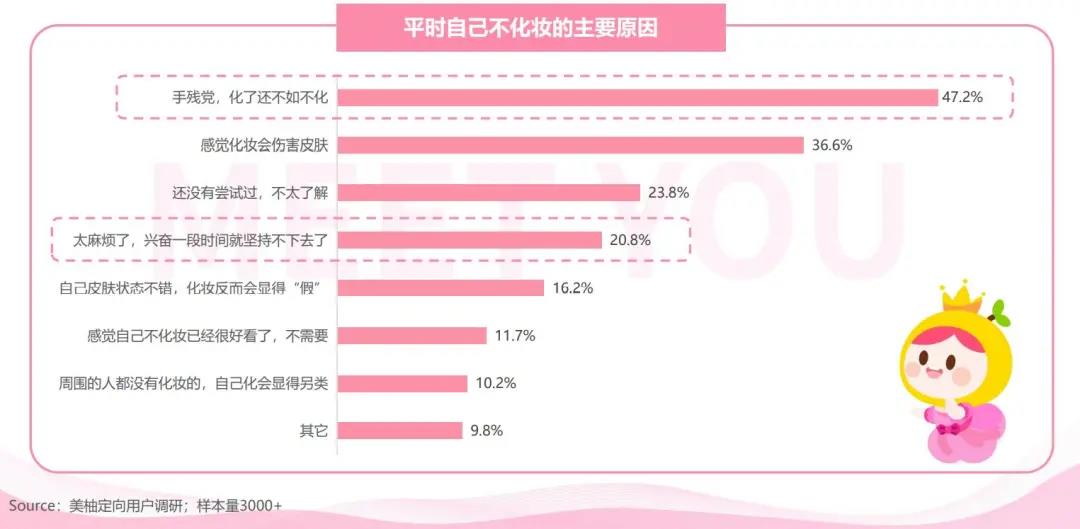 阻碍潜在消费人群使用彩妆的原因集中在“认为自己技术不行”和“感觉化妆会伤害皮肤”。