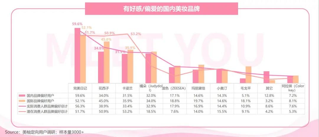 报告显示,无论是彩妆实际消费人群或是潜在消费群体,国货的渗透率均比国际品牌高。即使是国际彩妆消费者也会偶尔使用国货。国货彩妆的消费潜力十分巨大。“价格亲民”和“效果堪比国际大牌”是国货彩妆收获大批爱好者的主要原因。随着完美日记、花西子等国货品牌的崛起,越来越多的彩妆国货品牌受到消费者的青睐。
