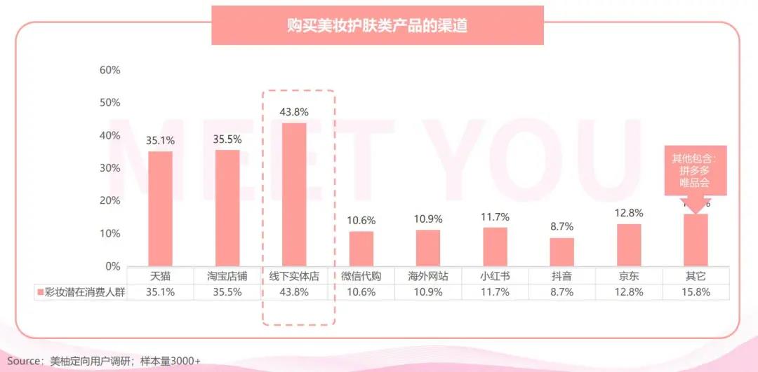 消费者通常在内容平台种草后,就会到天猫、淘宝、线下门店拔草。因此品牌可以通过内容平台种草后将消费者引流到对应的渠道消费。天猫、淘宝店铺和线下实体店是年轻女性的主要消费阵地。对比来看,彩妆实际消费者更偏爱电商,而潜在消费者则更习惯去线下实体店购物。