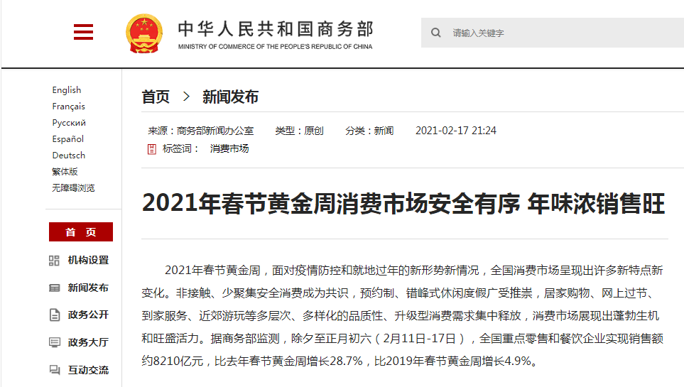 2月17日晚,商务部发布数据显示,除夕至正月初六(2月11日-17日),全国重点零售和餐饮企业实现的销售额为8210亿元,比去年春节同期增长了28.7%,其中化妆品销售增幅超过了100%。