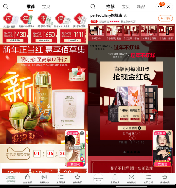 比如完美日记的“家是最美中国色”新年限量礼盒;花西子的“东方佳人妆奁”、“陌上相思花开同心礼盒”;上海家化也于1月底上线了佰草集“花样.时光”2021新年礼盒。伴随限定礼盒装出现的是企业推出的打折、降价等优惠活动。比如,完美日记等品牌在线上推出直播间定点抢红包、满减满赠、部分产品买一送一、抢购优惠券等活动,吸引客流,拉动销量。除各品牌的价格折扣,电商平台也推出优惠活动。据了解,美妆年货节期间,拼多多推出“百亿补贴”,派发30亿优惠红包,多款美妆产品价格直降百元。值得注意的是,尽管恰逢情人节,但根据生意参谋数据显示,香水、彩妆套装等适合送礼的品类,并没有如预期出现较高增幅,反而分别下滑9.61%和52.86%。但总体上,2021春节期间,社会消费品零售总额呈现出线下回暖延续、线上维持快增的趋势。在以内循环为核心的“双循环”新格局下,中国经济的“大海”拥有足够的韧性、巨大的潜力和不断迸发的创新活力,其将为中国美妆行业发展提供沃土!