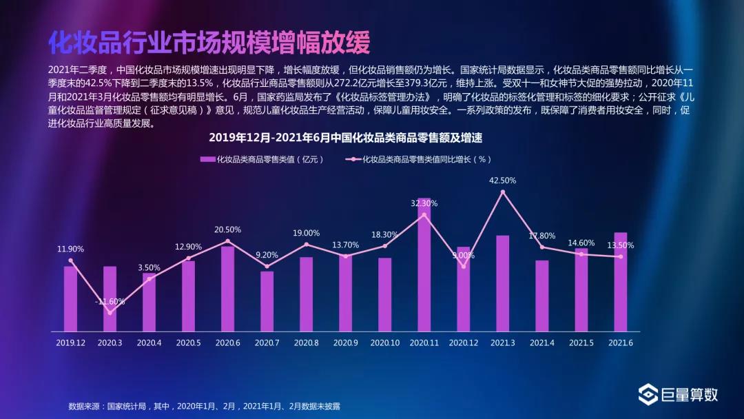 近日,以今日头条、抖音、西瓜视频等内容消费场景为依托的巨量算数发布了《2021Q2美妆行业季度洞察报告》显示,2021年二季度,中国化妆品市场规模增速出现明显下降,增长幅度放缓,但化妆品销售额仍为增长。