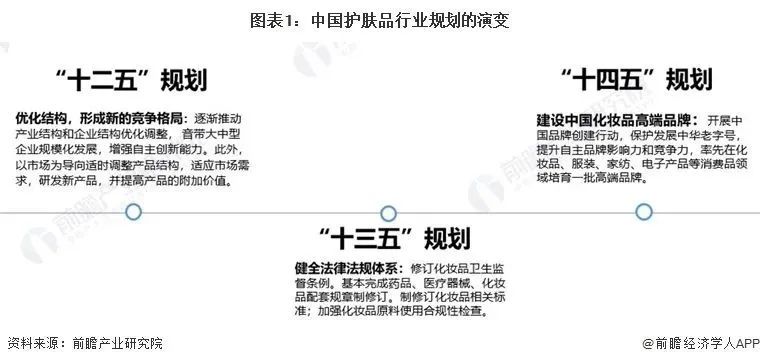 护肤品作为化妆品行业的重要分支,我国护肤品行业政策主要集中在国家药监局对化妆品的行业政策中,其对化妆品的规范及规划同样适用于护肤品。根据我国化妆品行业“十二五”至“十四五”规划,国家对护肤品行业的政策经历了从“优化结构发展”到“安全规范发展”再到“高端品牌发展”的变化。