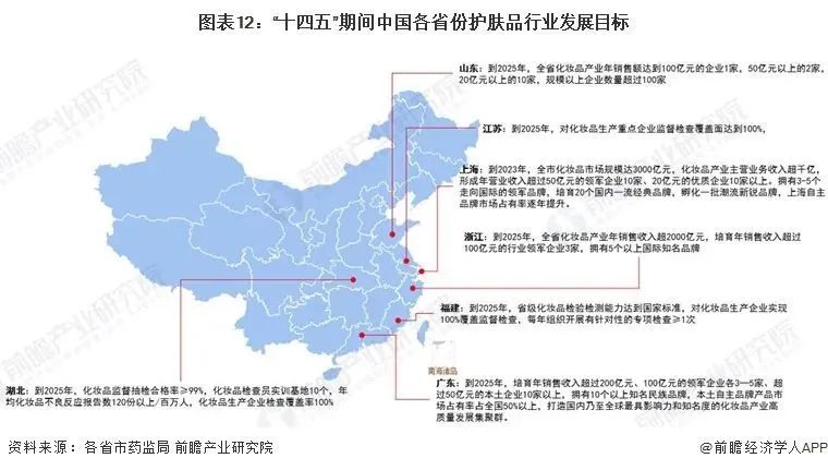 “十四五”期间,我国主要省份也提出了护肤品行业的发展目标。其中,广东、山东和浙江均提出了至2025年末的化妆品产业年销售额不同区间企业数量,上海提出至2023年末化妆品产业年销售额不同区间企业数量。此外,福建、湖北和江苏提出了化妆品产业的监督量化指标: