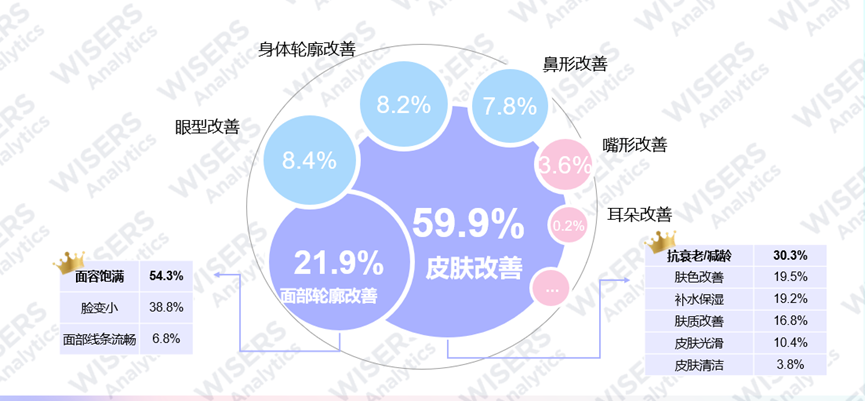 ▷ 对于入门级医美用户来说,皮肤改善和面部轮廓改善是每位用户颜值提升的共同核心诉求,其中59.9%的用户对皮肤改善的需求最高。