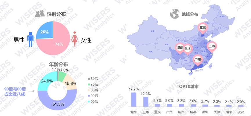 ▷ 在研究的互联网人群中,用户年龄段以90后和00后年轻群体为主;除北上广外,成都和重庆所在的西南地区也是用户们的聚集地;其中TOP前十的城市为北京、上海、重庆、广州、杭州、成都、深圳、天津、南京、武汉。北京以17.7%的占比稳居TOP 1。