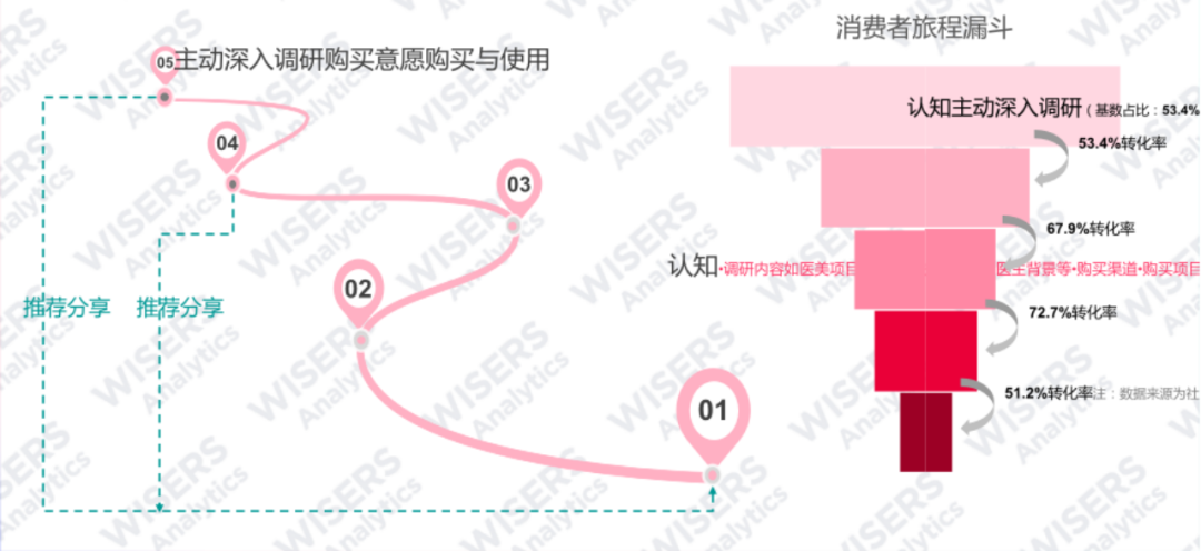 ▷ 总结一下为:当下医美用户的消费旅程更复杂化,考量因素更多元化,决策更加审慎。主要分为五个阶段:了解调研 → 购买意愿 → 购买使用 → 复购转换 → 推荐分享。