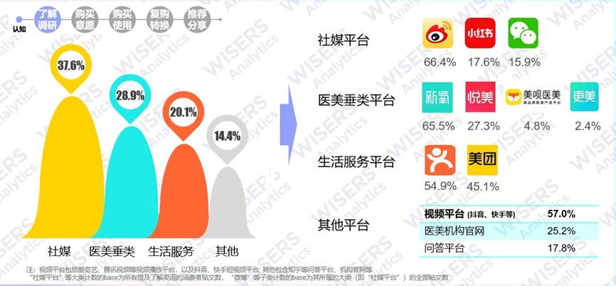 ▷ 当下医美用户主要通过社媒平台和医美垂类平台主动深入了解,其中占比最多的是社媒和垂类医美平台,这两项比例高达66.5%,其中社媒平台中微博的占有率最高,达到66.4%,医美垂类平台新氧占比高达65.5%。