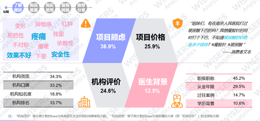 ▷ 当下消费者在做决策时,影响最终决策的因素更多,用户会主动调研内容如医美项目、价格、机构评价、医生背景等,用户决策周期更长,且考虑障碍因素主要有项目风险和隐患担忧,如疼痛/不适、后遗症、效果不如预期等,让用户更为理智谨慎。