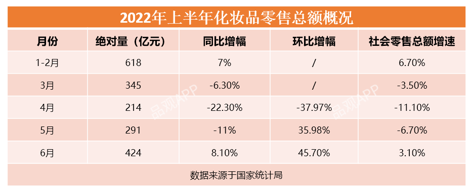 整体而言,虽然6月,化妆品类零售总额恢复正增长。但整个上半年,化妆品类零售并没有跑赢大盘。