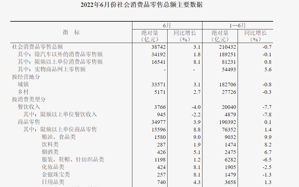 今日(7月15日),国家统计局发布6月份社会消费品零售总额主要数据:6月份,社会消费品零售总额达38742亿元,同比增长3.1%;其中,限额以上化妆品类零售总额为424亿元,同比增长8.1%,增幅较上月上涨了19.1个百分点。