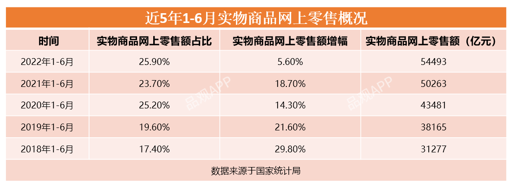 根据国家统计局数据,今年上半年,全国网上零售额63007亿元,同比增长3.1%。其中,实物商品网上零售额54493亿元,增长5.6%,占社会消费品零售总额的比重为25.9%。