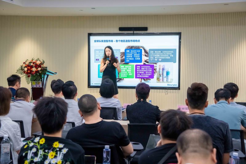 活动上,诺力昂亚太区市场经理南丽娜女士从全球头发造型概览、打造产品多元化、沙龙线/专业体验三大方面向我们生动讲解了《全球美发品市场报告》,图文并茂向我们展示了全球不同地区的头发造型市场概况、造型消费品类型特点、不同性别消费偏好、不同地区消费者对美发用品选择的趋势等全球美发市场信息资讯,并从打造产品多元化、更好地推进沙龙线/专业体验等方面方面提出全面、科学、耳目一新的建议,满满的干货,让与会人员享受到丰富的美业精神大餐。