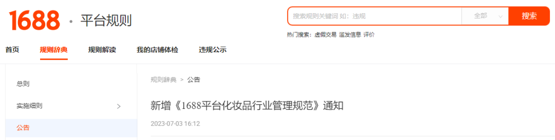 为了规范1688平台的市场内化妆品行业的管理秩序,为买家营造安全安心的网购环境,提升买家的购买信心和满意度,1688拟新增《1688平台化妆品行业管理规范》,此次规则于2023年7月3日进行公示通知,将于2023年7月9日正式生效。
