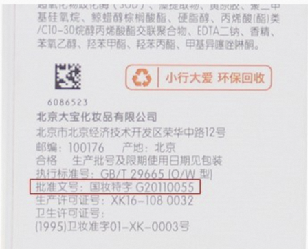 正规产品的中文标签上即能找到国产特殊用途化妆品的批准文号,例如常见的以国妆特字打头的国产特殊用途化妆品,如下图所示: