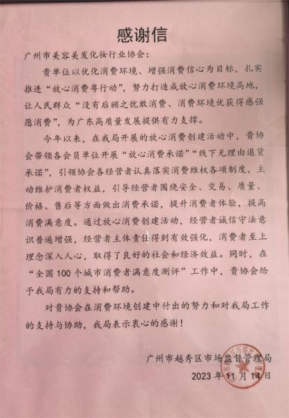 近日,我会收到了广州市越秀区市场监督管理局工作人员亲手送来的感谢信,对我会在全市社会经济发展和行业规范当中做出的工作给予了肯定和表扬。