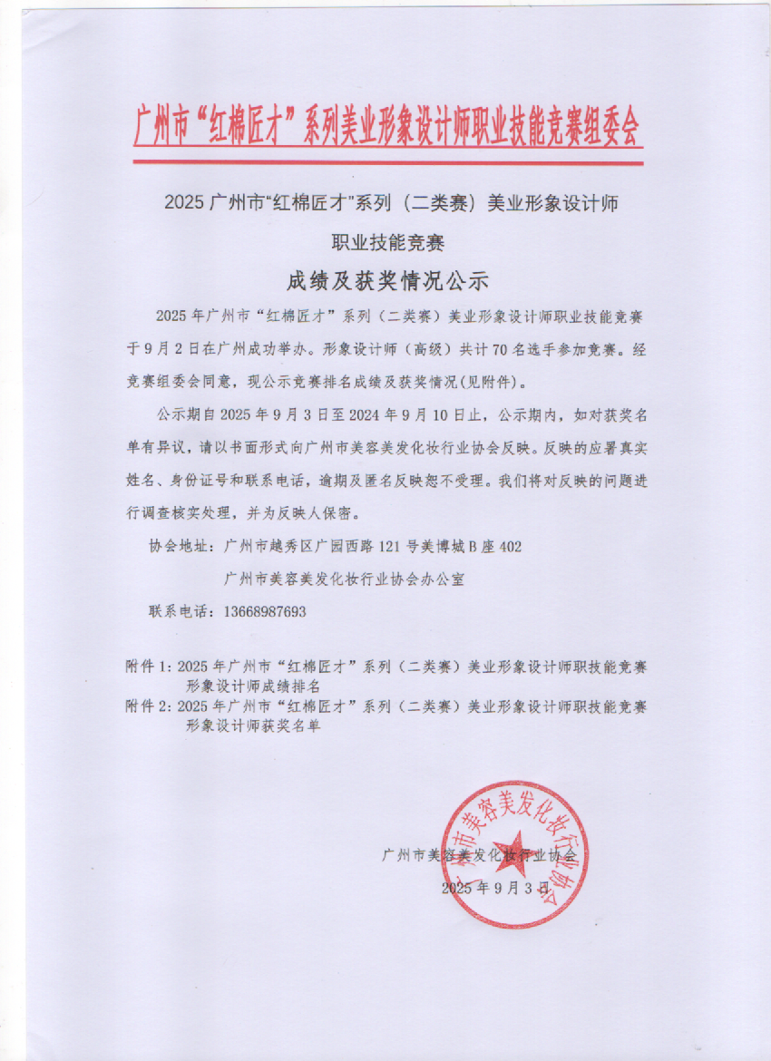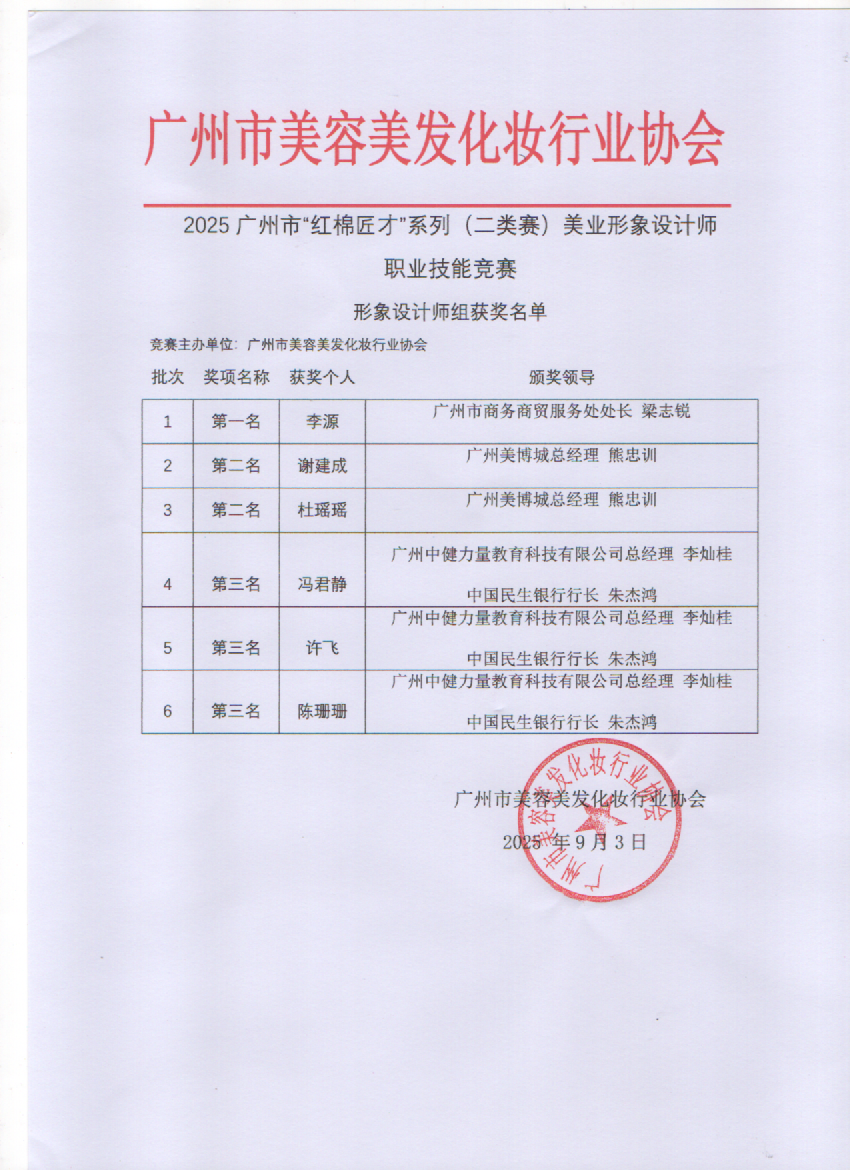 2025年广州市“红棉匠才”系列美业形象设计师职业技能竞赛成绩及获奖名单公示